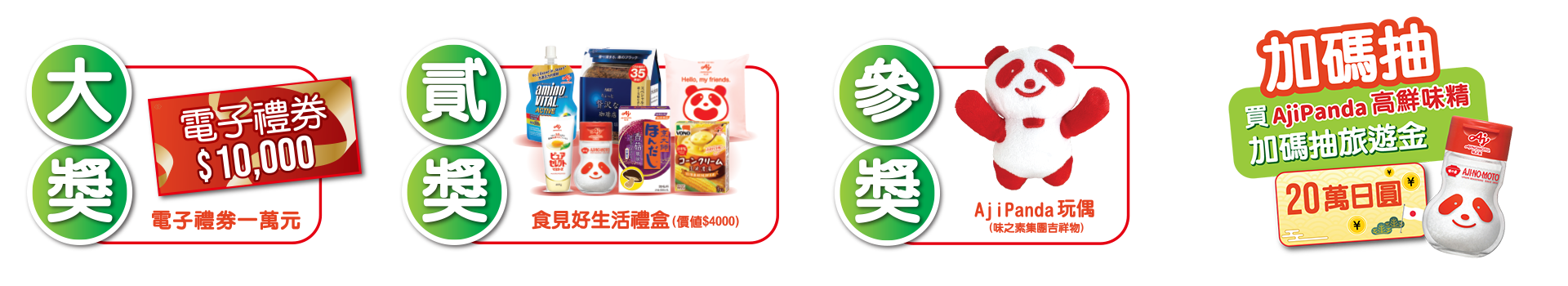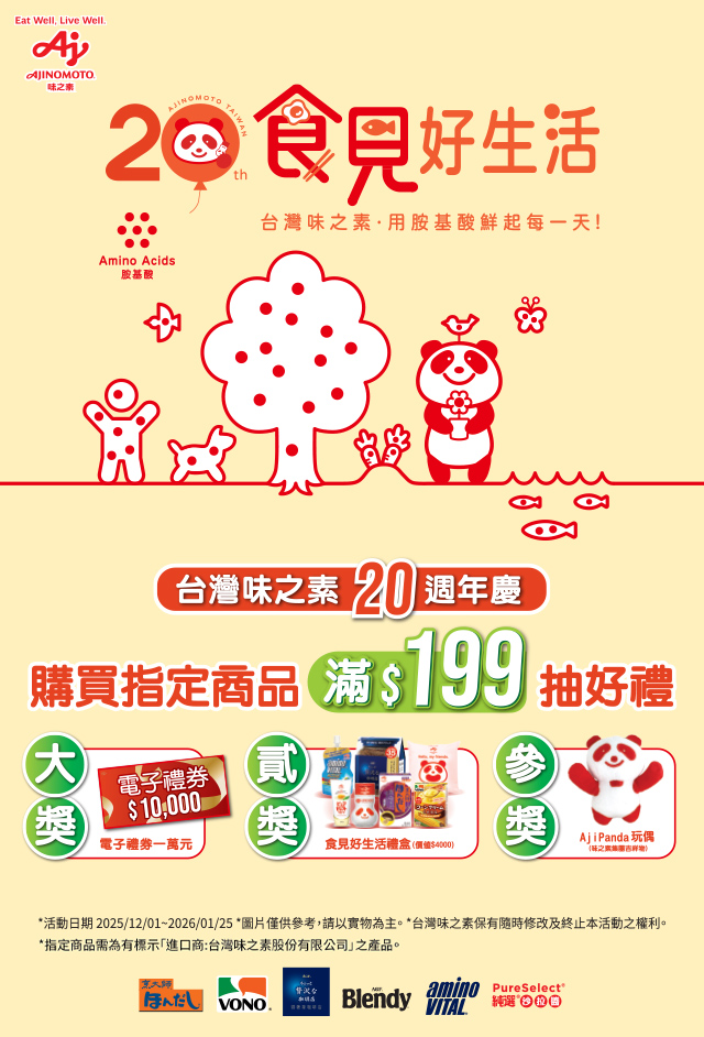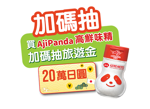 活動期間內購買『味之素指定活動產品』單筆滿199元(以購買活動產品折扣後金額計算),至活動網站登錄發票號碼等相關資料並上傳發票照片即可參加抽獎。上述符合抽獎之發票同時有購買「味之素®AjiPanda®高鮮味精」,且為指定通路全聯福利中心、家樂福、百貨超市、味之素線上購,可加碼再抽特別獎!
